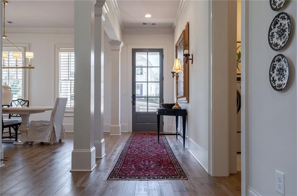 Welcome to 2970 Greenleffe Drive, a picture-perfect Southern charmer nestled in the sought-after Charleston Park neighborhood of The Georgia Club. This beautifully renovated 3-bedroom, 3.5-bathroom home offers 2,380 square feet of thoughtfully curated living space. With timeless curb appeal, a brick walkway, and a wide covered front porch, this home radiates true Southern hospitality. The porch, featuring brick flooring, classic columns, and elegant lighting, offers the ideal setting for morning coffee or evening sunsets while overlooking the tranquil, private greenspace adjacent to the home. Inside, youre greeted by a stunning interior boasting hardwood floors, detailed millwork, and sophisticated finishes throughout. Whether hosting guests or enjoying everyday life, this home delivers the perfect balance of style, comfort, and connection. Step through the front door into a gracious entry hall that immediately sets the tone with its understated elegance. The warm wood flooring and soft neutral palette continue into the formal dining room, where an abundance of natural light streams through plantation-shuttered windows. Ideal for both intimate dinners and lively gatherings, the space offers a timeless layout that adds character just steps from the foyer. The kitchen is truly the heart of this home a beautifully designed space that encompasses both functionality and style. A large center island offers ample seating and storage, while custom milled floating shelves, crisp white custom cabinetry, and dramatic quartzite countertops that extend to the backsplash, elevate the overall aesthetic. A Kohler farmhouse sink and top-of-the-line Thermador stainless-steel appliances including a gas range and French door refrigerator ensure a premium culinary experience. Designer curated Visual Comfort lighting add the perfect finishing touches to the space. Open to the kitchen, the living room provides a relaxed yet sophisticated setting for everyday living or entertaining. Light drifts in, giving the space a bright and airy feel that accentuates the hardwood floors and crown molding. A cozy gas fireplace anchors the space, creating a welcoming focal point topped with a mantle ideal for artwork or a mounted TV. This open-concept layout fosters effortless flow and connection. The main-level primary suite is a true retreat, offering spacious comfort with refined touches. The spacious bedroom boasts stunning hardwood floors and is filled with natural light. The luxurious ensuite bath features dual vanities, a dedicated makeup station, sleek gold fixtures and Visual Comfort lighting. The oversized tiled shower includes both a rain shower head and a slider bar hand shower, and a built-in bench for added comfort. A generously sized walk-in closet with custom closet system connects directly to the laundry room, creating unmatched convenience. Upstairs, two additional bedrooms and a loft space provide flexibility for guests, family, and home office needs. One bedroom includes its own en-suite bath, while a second full bathroom is easily accessed from the hallway. Each space is designed for comfort and practicality, with tasteful finishes and ample storage. Outside, a private courtyard awaits complete with a covered patio, easy-care turf grass, and a beautifully lit privacy wall. This inviting space is perfect for outdoor dining, entertaining, or simply relaxing. Ceiling fans and Visual Comfort sconces enhance both comfort and ambiance, while direct acce