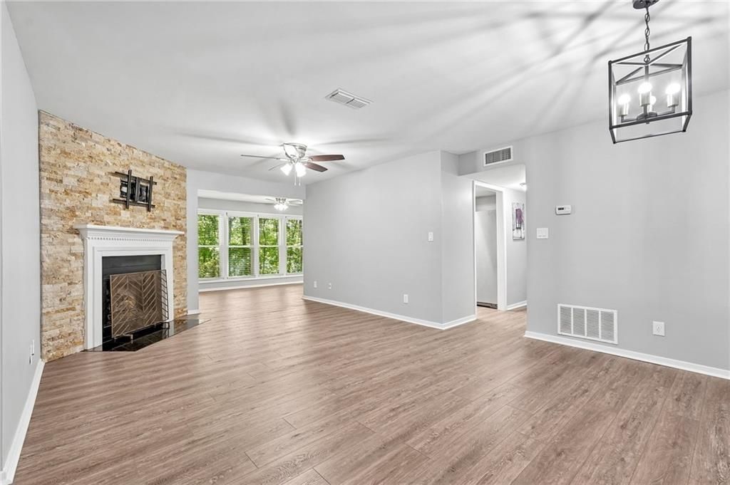 Welcome to this beautifully updated home in the desirable Canyon Point community of Roswell. This move-in ready home features NEW hardwood floors throughout, freshly painted, resurfaced ceilings, and custom solid wood interior doors with updated hardware that add both style and noise reduction. The kitchen and bathrooms have been thoughtfully renovated with quartz countertops and new cabinetry. The primary suite offers a walk-in closet and a well-appointed bath. Major updates provide peace of mind, including new windows, a water heater replaced in 2022, and the roof and siding replaced in 2021. Enjoy the extended patio overlooking a private wooded setting where deer are often seen. The resurfaced saltwater pool creates the perfect space for relaxing or entertaining. Conveniently located near downtown Roswell with easy access to shopping, dining, and nearby parks including East Roswell Park, Big Creek Park & Greenway, and the Chattahoochee River trails.
