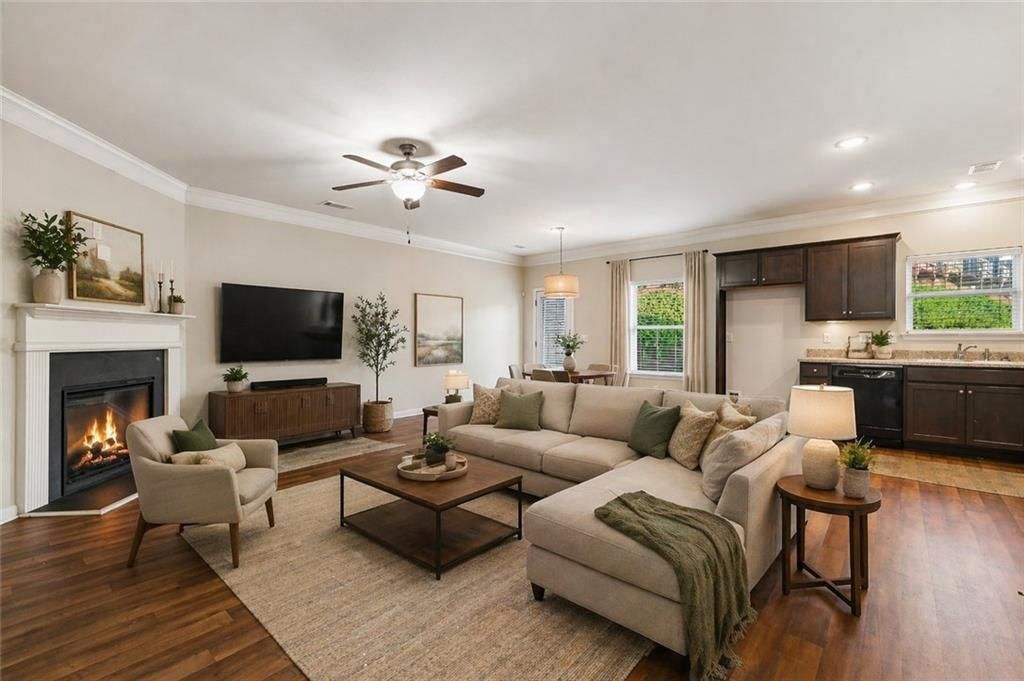 Charming 3BR/2.5BA Townhome with Scenic View! Fresh paint and new LVP flooring throughout. Open-concept kitchen with stainless steel appliances and pendant lighting overlooks the family room and dining area. Cozy fireplace in the family room. Spacious primary suite with tray ceiling, double vanity, and separate tub/shower. Two additional bedrooms share a full bath. Community amenities include swim, tennis, clubhouse, sidewalks, and greenspace. Move-in ready!