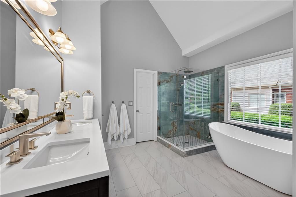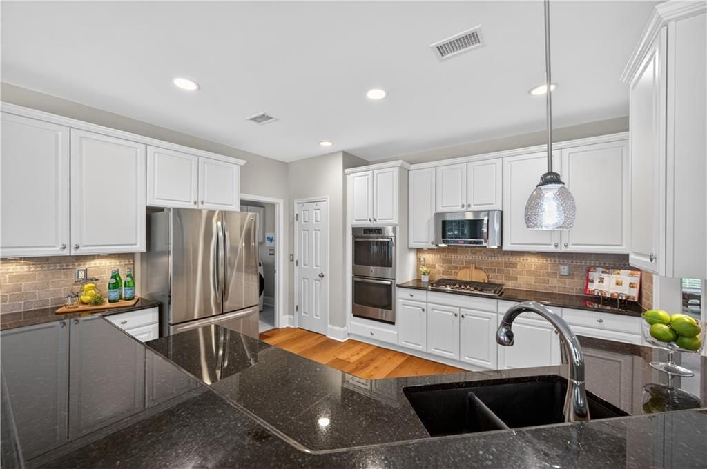 A MUST-SEE, this beautifully maintained 4-bedroom, 3.5-bath residence is ideally positioned on a desirable cul-de-sac in sought-after Olde Atlanta Club. Featuring three-sides brick construction and a thoughtfully designed PRIMARY-ON-MAIN floorplan, this home blends timeless architecture with modern updates. STUNNING METAL FRONT DOORS create a memorable first impression as you step inside to discover RECENTLY INSTALLED WIDE PLANK ENGINEERED HARDWOOD FLOORS that flow seamlessly across the main level. The main floor offers a spacious dining room, versatile flex space ideal for a home office or reading room, and an inviting family room anchored by a stunning stone fireplace and hearth. The charming fireplace is a favorite feature on cold winter nights providing extra warmth from the special designed heat efficiency insert with a circulating blower. The bright, open kitchen offers the ease of everyday living and entertaining while prepping for scrumptious meals. The kitchen features: white cabinetry, granite countertops, gas cooktop, double ovens, Bosch dishwasher, stainless steel appliances, and a generous breakfast area with direct access to the outdoor living space. The recently REPLACED WALL OF WINDOWS spans the back of the home, filling the interior with natural light and offering serene views of the private backyard. The main-level primary suite is a true retreat, complete with trey ceilings and a FULLY UPDATED, SPA-INSPIRED BATH featuring double vanity, a soaking tub, and a frameless glass shower designed to evoke a relaxing, coastal feel, enhanced by a recently installed tankless water heater for continuous hot water. Upstairs, you'll find three additional bedrooms and two full baths, including a private en-suite bedroom. Outdoor living is equally impressive, with an extended patio offering multiple lounging areas, lush landscaping, and a wraparound walkway leading to the flat side yard. Located within Olde Atlanta Club, residents enjoy resort-style amenities including championship golf, swim and tennis, pickleball, basketball courts, playground, and a vibrant community lifestyle. Zoned for the award-winning Lambert High School district, this home offers an exceptional opportunity to enjoy both luxury and convenience in one of Forsyth County's most desirable communities.