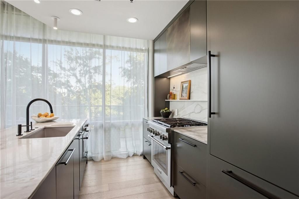 Midtown living at its best in one of the most sought after condo buildings in the area! This spacious CORNER unit is in one of the most desirable locations in the building, on the quieter northeast corner w/ incredible views and away from the busier street! This home features 2 bedrooms & 2 baths with 3 balconies that offer multiple options for outdoor relaxing and change of scenery. Floor to ceiling windows fill the unit with natural light and beautiful views. This unit received a complete renovation in 2023 (the primary bath had already been previously renovated). Dana Lynch designed, making for a cohesive, modern yet warm feel. Engineered Laasko-Valley hardwood, 7.5 white oak flooring throughout. Custom wallpaper in foyer/hallway wrapping into the living room. The stunning kitchen features Keystone Millwork custom wooden slab cabinetry w/ paneled appliances. Thermador dual fuel 30 range w/ Thermador vent insert that vents to the outside (rare at 905 Juniper). The hood features antiqued-finished metal panel imported from Holland. Large Fumo di Toscana polished marble covered island and countertops w/ integrated backsplash w/ stone shelf. Cedar & Moss Fjord spotlights, Legrand Adorne Pop-Out outlets. In the primary bedroom, you'll find Matthews fan company ceiling fan and custom blackout drapes. Primary Bath was previously renovated and boasts separate soaking tub and shower with dual shower heads, marble throughout, Kohler one-piece toilet and painted cabinetry. Secondary bedroom is currently used as den w/ Keystone Millwork custom bar, paneled beverage center, wrap around custom drapes that conceal a spacious, custom closet system, designed/installed by Creative Closets. The brass, modern light fixture and custom Rustica 3-piece glass/steel accordion door system with fluted glass provides the Wow factor. The hallway/second bath boasts Zecevo polished limestone countertop on an oversized floating vanity, Brizo wall-mounted fixture, walk-in shower with Terrazzo slab tiling, Kohler showerhead and separate hand-held shower head, Kohler one-piece toilet and custom lighting. Other highlights include Fittes flush wall and ceiling vent covers, updated door hardware throughout, Nest thermostat and Nest smoke detectors and curated painting throughout. The spacious storage room in the hallway double as a walk-in pantry, laundry and general storage room. 905 Juniper amenities include a resort-style pool, recently updated club house, fitness center, and friendly 18-hr/day concierge. Renovation of the lobby has also just been approved. There are 2 ideally located parking spaces and a large storage unit included. This is a prime location for those who want a walkable lifestyle, close to shops, restaurants, walk to Piedmont Park, the Beltline and much more!