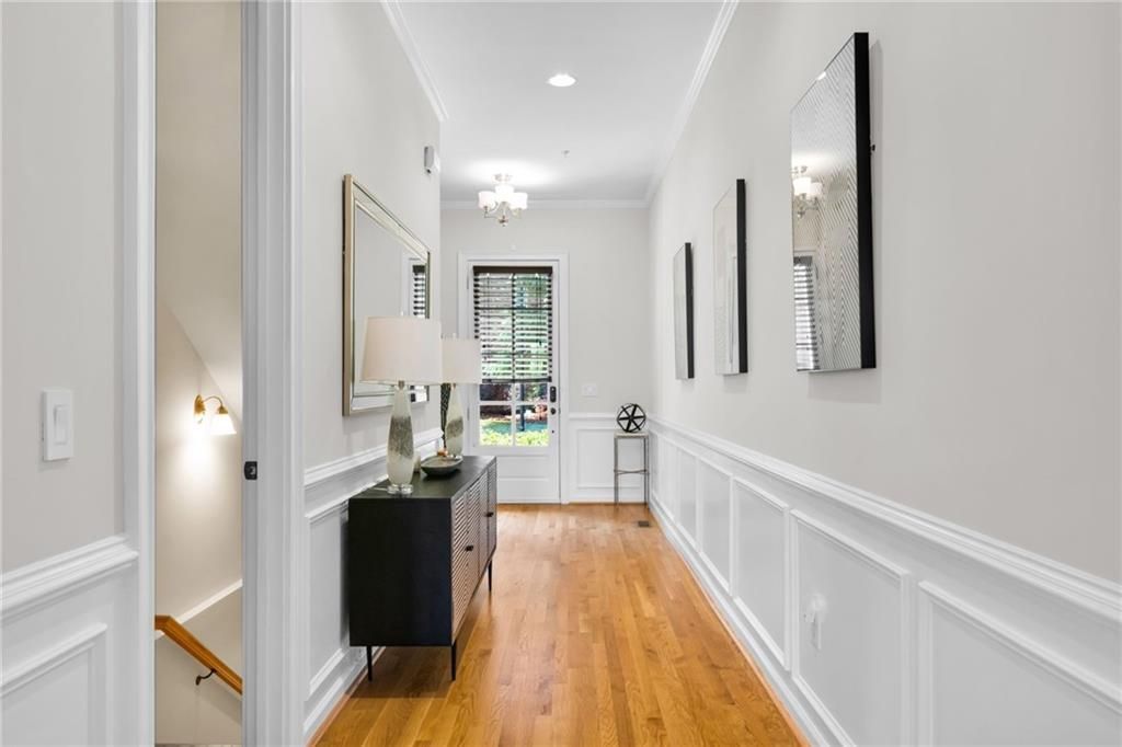 Welcome home to Lafayette Square, a beautiful gated community that offers the perfect balance of convenience and peaceful living.This private entry townhome welcomes you with a charming covered portico and grand columns, and once inside, tall ceilings, warm hardwood floors on all three levels, and a wide entry draw you naturally into the family room, featuring a judges panel wall, fireplace with gas logs, and a gorgeous wall of windows that fills the space with wonderful natural light. The open concept flows beautifully into the updated kitchen with quartz countertop and eating area and onto the back deck that looks out to mature, peaceful landscaping.Hardwood floors continue upstairs through the hall and into the generous primary suite, complete with a double vanity, soaking tub, separate shower and a dreamy custom walk-in closet with built-in shelving. Two secondary bedrooms share a full bathroom, one with a walk-in closet, and the upper level laundry room with cabinetry adds a truly thoughtful touch of everyday ease.The finished basement is a wonderful bonus, offering a media room, bedroom, and full bathroom, a comfortable and private space for guests, teens, or extended family to truly feel at home.Tucked away inside a gated community in the back, this home offers the peace and privacy you deserve, while keeping you just minutes from great shopping, dining, and major highways, so everything you need is within easy reach in Sandy Springs, and coming home still feels like your own little retreat.